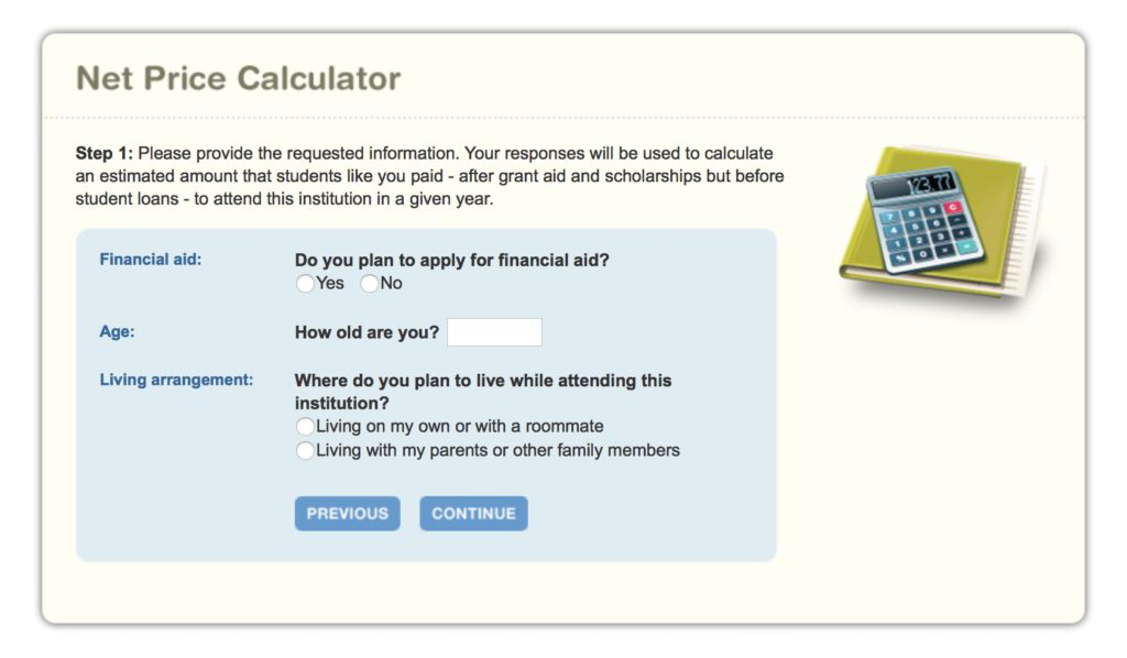 The provided calculator is intended to provide estimated net price information—defined as estimated cost of attendance, including tuition and required fees, books and supplies, room and board (meals), and other related expenses, minus estimated grant and scholarship aid—to current and prospective students and their families based on what similar students paid in a previous year.